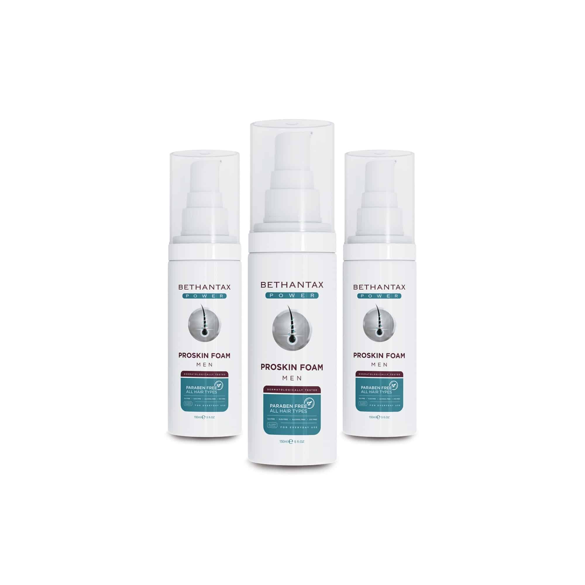 Buy 2 Get 1 Free bundle of Bethantax Power ProSkin moisturizing foam. Three 150 ml bottles (450 ml total) of Turkish scalp hydration foam for post-transplant care. Save 33%.