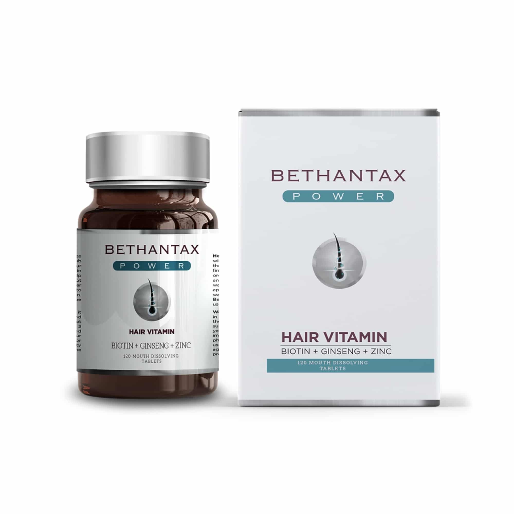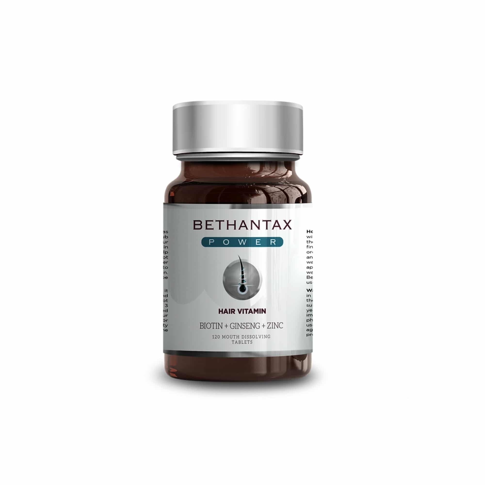 Comprehensive hair vitamin complex with biotin, zinc, iron and B-vitamins. Bethantax Power Turkish formula supports hair growth from within. 120 tablets, 4-month supply. ISO and GMP certified.