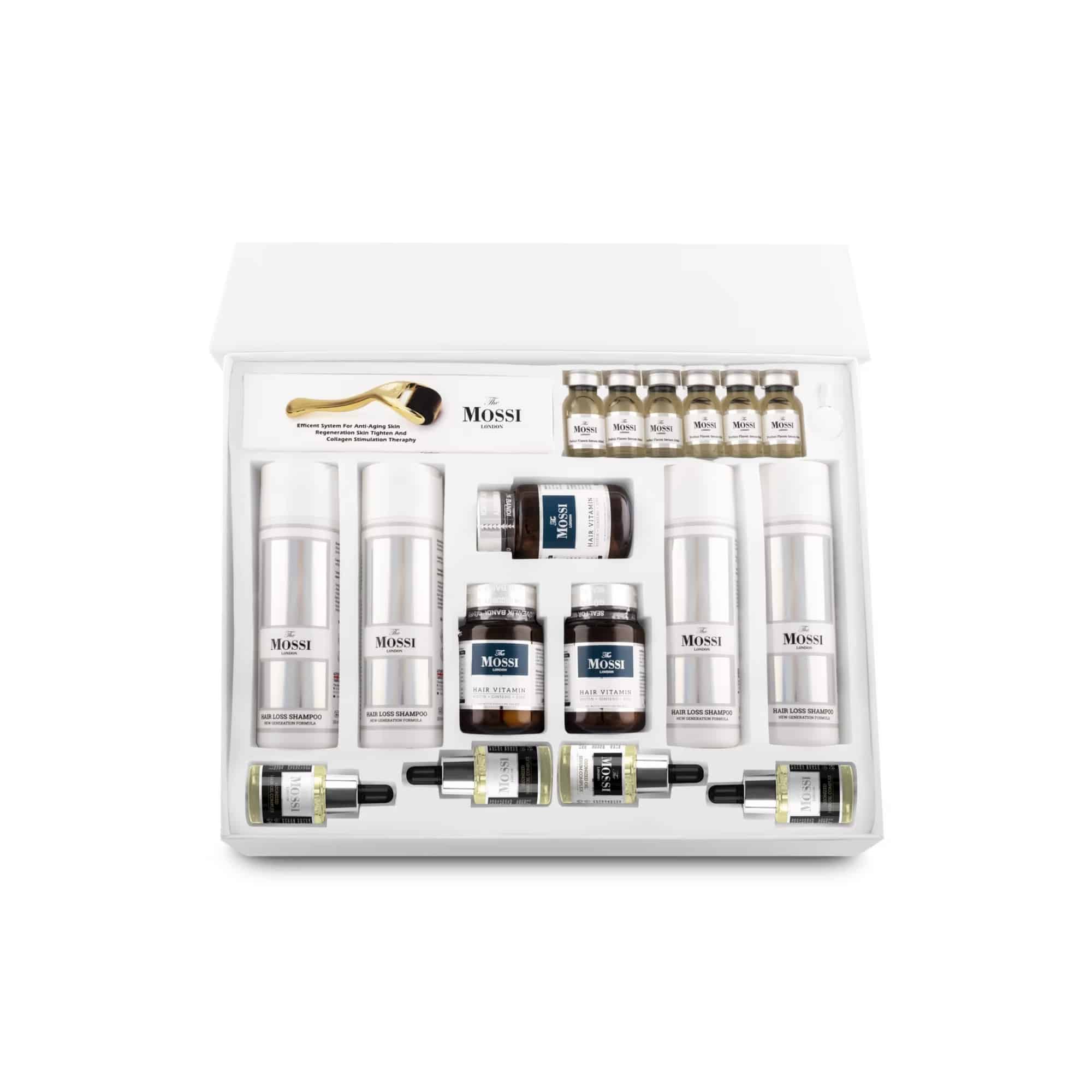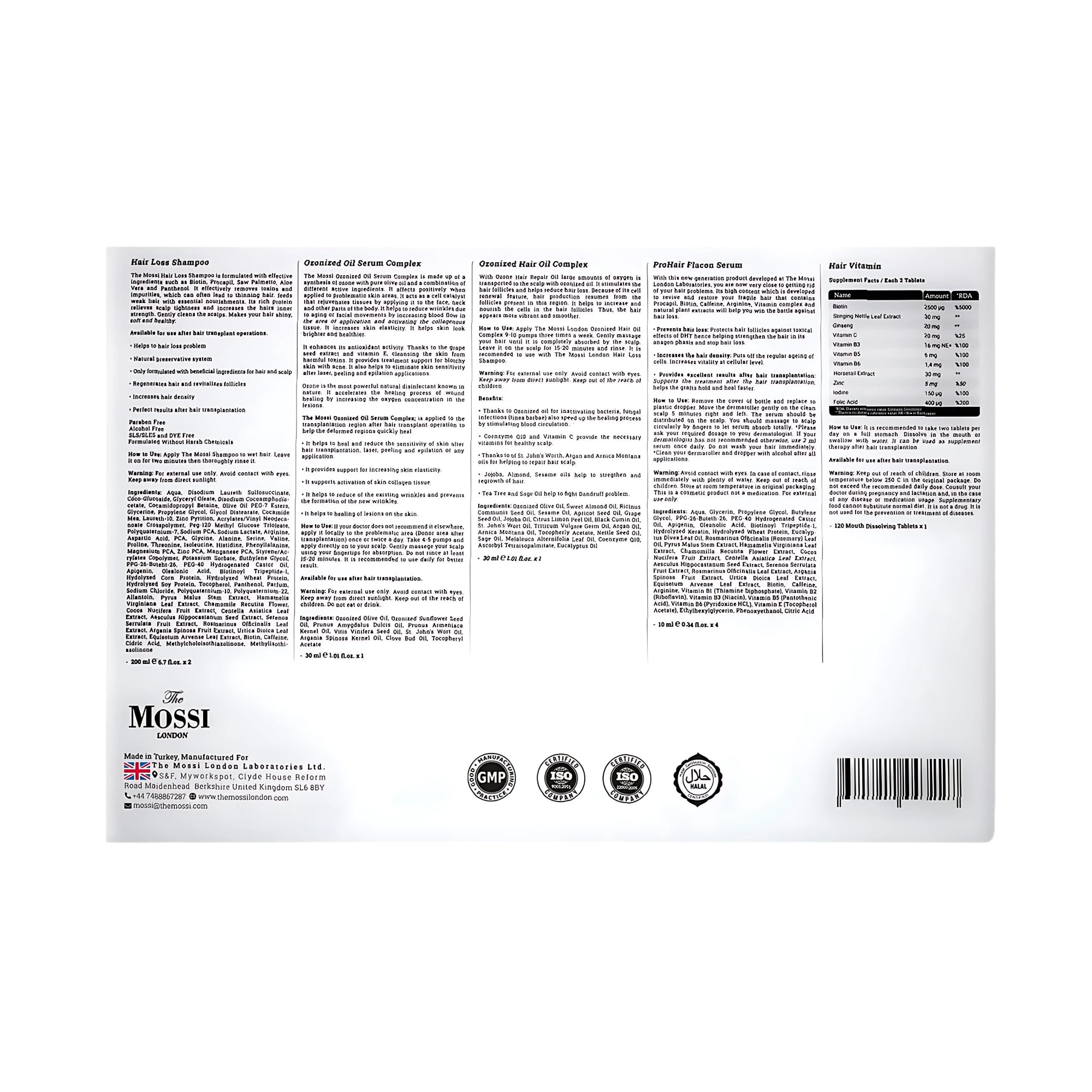 The Mossi London 6-Month Flacon Plus Set is the ultimate full-cycle hair regrowth program — the most comprehensive treatment package available from The Mossi London. This set contains a complete 6-month supply of every product category needed for professional-grade hair restoration: multiple flacon mesotherapy serum sets, full-size shampoos, daily spray serums, concentrated repair serums, ozonized scalp therapy oils, moisturising foams and a full course of hair vitamins. Designed by The Mossi London in Turkey — where hair transplant science and post-operative care have been developed to the highest standard in the world — this program covers the entire timeline that clinical research identifies as necessary for maximum hair regrowth results. Six months of consistent, multi-product treatment is the gold standard recommended by Turkish trichologists, and this set ensures you have every product needed for the entire journey without gaps, reordering delays or supply interruptions that can undermine your results.